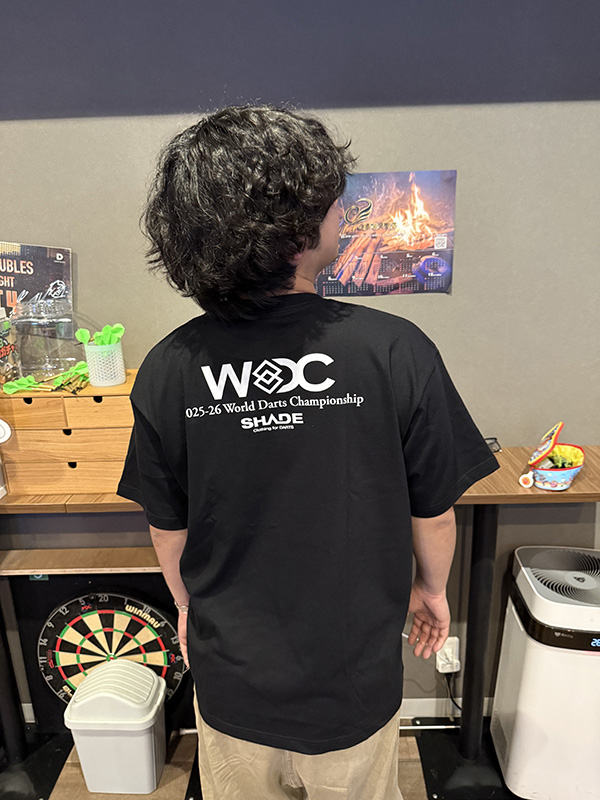 背面には「WORLD DARTS CHAMPIONSHIP」と組み合わせた限定仕様のSHADEロゴを採用。