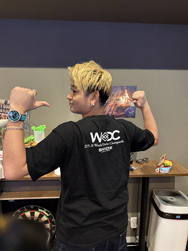 背面には「WORLD DARTS CHAMPIONSHIP」と組み合わせた限定仕様のSHADEロゴを採用。
